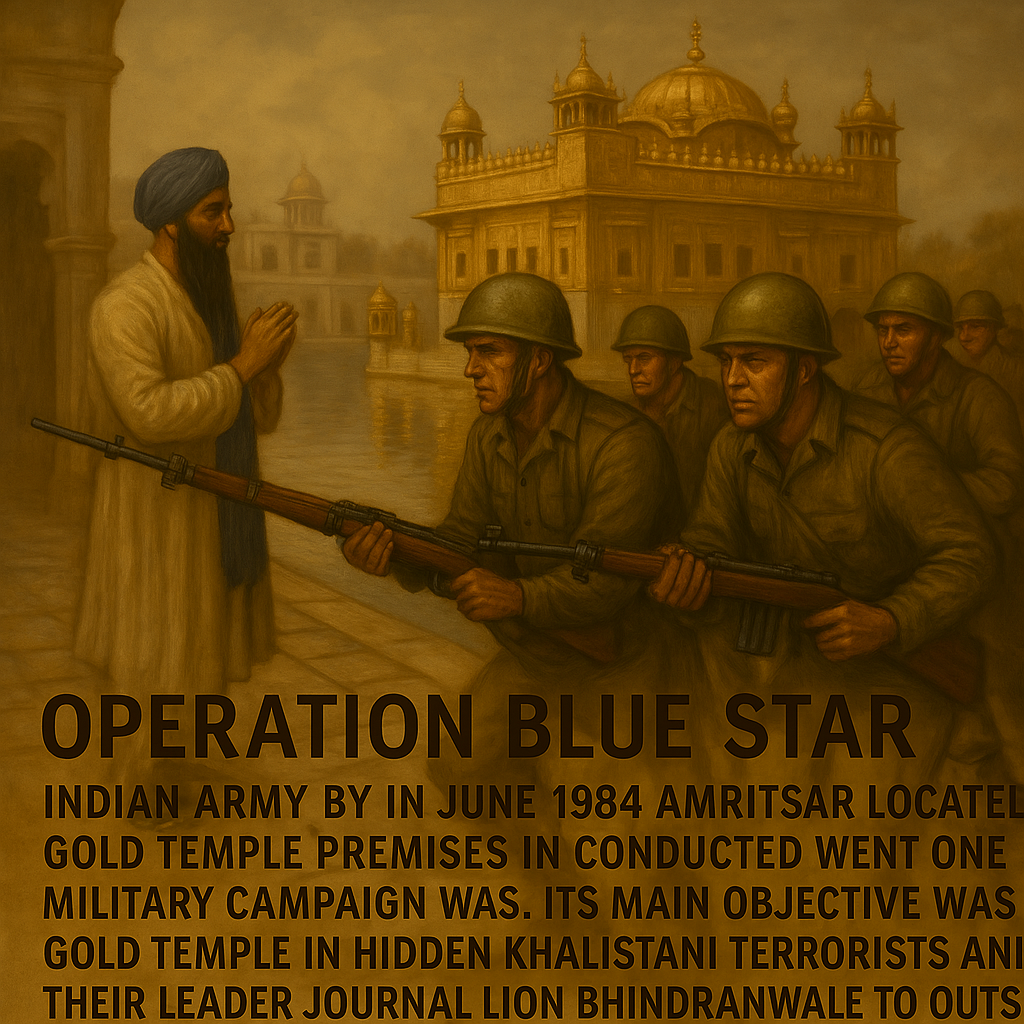 • June 1984 In Indian Army by operation blue Star Of under Amritsar Located Gold Temple premises In by sneaking in Khalistani militant General Arora Lion Bhindranwale And Their Supporters Of Against action of.